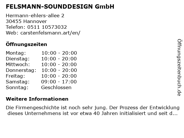 | Öffnungszeiten FELSMANN-SOUNDDESIGN GmbH in Hannover anzeigen | |