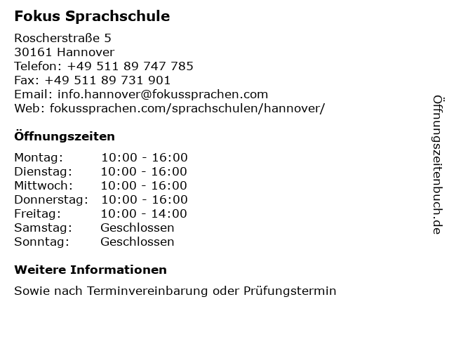 | Öffnungszeiten Fokus Sprachschule in Hannover anzeigen | |