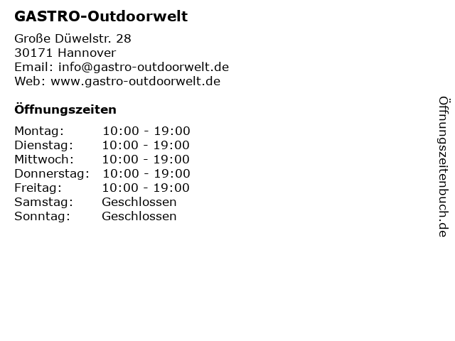 | Öffnungszeiten GASTRO-Outdoorwelt in Hannover anzeigen | |
