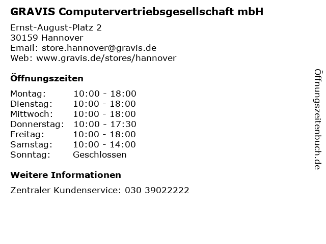 | Öffnungszeiten GRAVIS Computervertriebsgesellschaft mbH in Hannover anzeigen | |