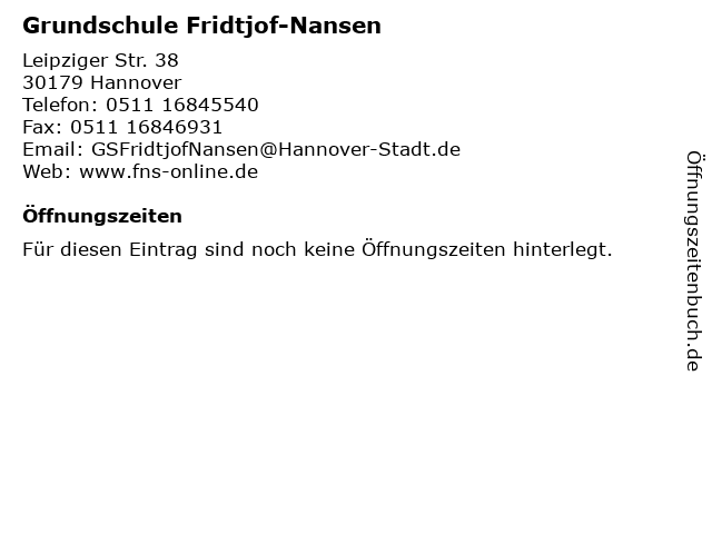 | Öffnungszeiten Grundschule Fridtjof-Nansen in Hannover anzeigen | |