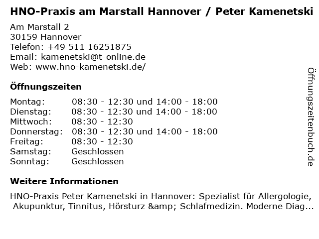 1 GUM Leder Marstall Textileinzelhandel, Motorradbekleidung, Lederbekleidung (Entfernung: 0,08 km) Knochenhauerstr. 1, 30159 Hannover 6 Dr. Jan Ahmadi & Kollegen, HNO FÄ Hannover Mitte (MVZ) (Entfernung: 0,17 km) Georgstraße 16, 30159 Hannover |