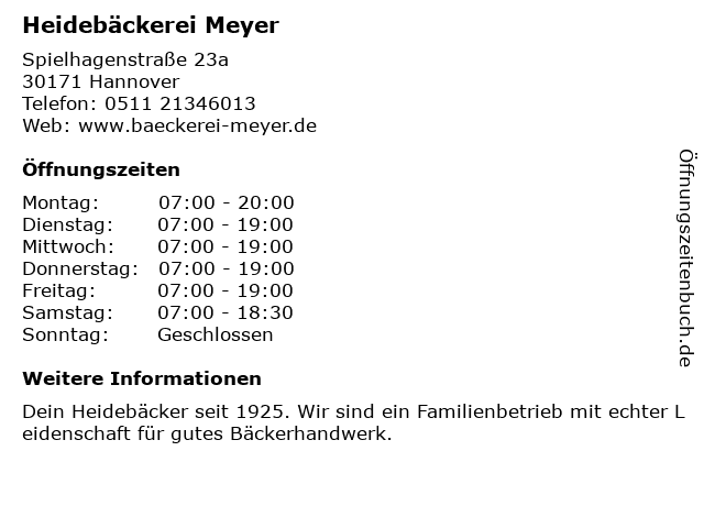 | Öffnungszeiten Heidebäckerei Meyer in Hannover anzeigen | |