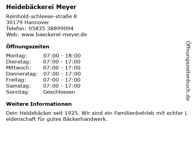 | Öffnungszeiten Heidebäckerei Meyer in Hannover anzeigen | |