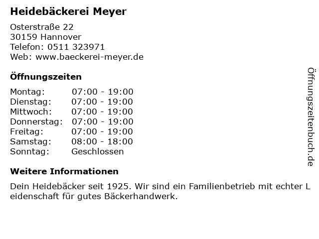 | Öffnungszeiten Heidebäckerei Meyer in Hannover anzeigen | |