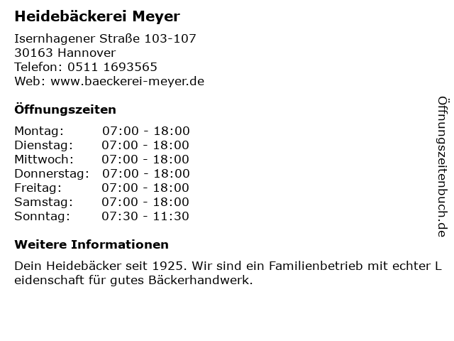 | Öffnungszeiten Heidebäckerei Meyer in Hannover anzeigen | |