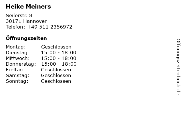 | Öffnungszeiten Heike Meiners in Hannover anzeigen | |