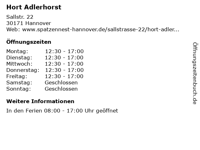 | Öffnungszeiten Hort Adlerhorst in Hannover anzeigen | |