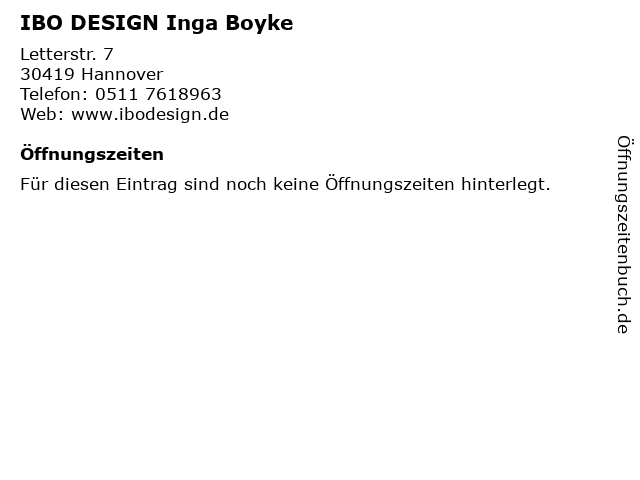 | Öffnungszeiten IBO DESIGN Inga Boyke in Hannover anzeigen | |