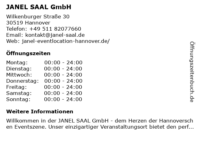 | Öffnungszeiten JANEL SAAL GmbH in Hannover anzeigen | |