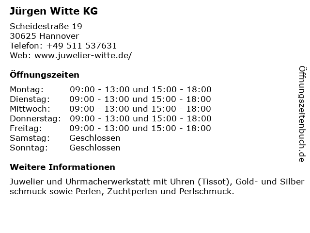 | Öffnungszeiten Jürgen Witte KG in Hannover anzeigen | |