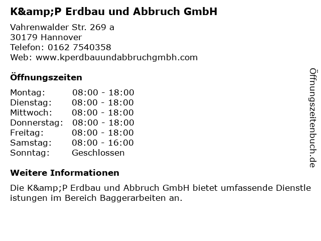 | Öffnungszeiten K&P Erdbau und Abbruch GmbH in Hannover anzeigen | |