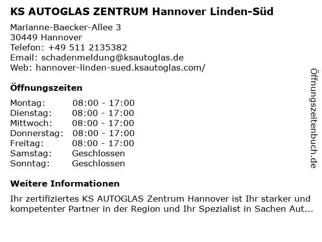 1 Carglass GmbH Service Center Hannover (Linden-Süd) (Entfernung: 0,02 km) Marianne-Baecker-Allee 1, 30449 Hannover 3 S.I.S. Süd-Industrie Anlagen-Service GmbH (Entfernung: 0,82 km) Göttinger Chaussee 12, 30453 Hannover 6 |