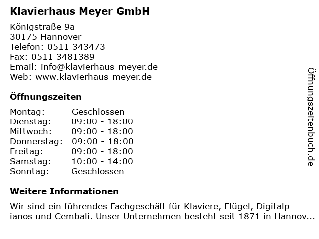 | Öffnungszeiten Klavierhaus Meyer GmbH in Hannover anzeigen | |