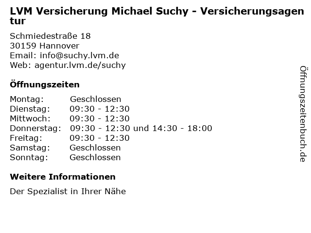 | Öffnungszeiten LVM Versicherung Michael Suchy - Versicherungsagentur in Hannover anzeigen | |