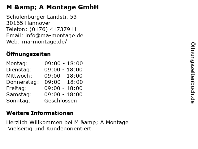 | Öffnungszeiten M & A Montage GmbH in Hannover anzeigen | |
