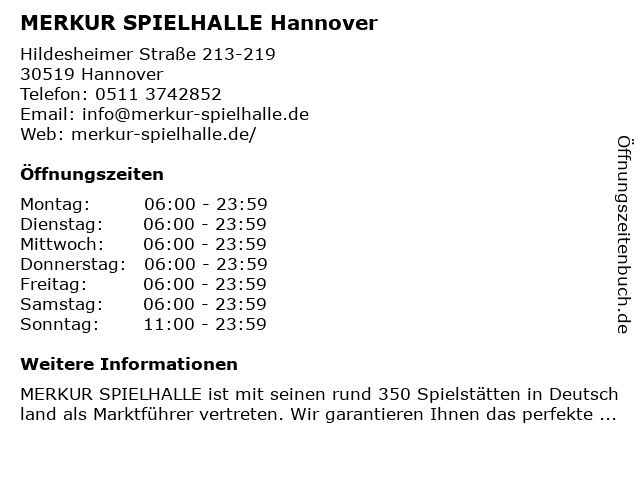 | Öffnungszeiten MERKUR SPIELHALLE Hannover in Hannover anzeigen | |