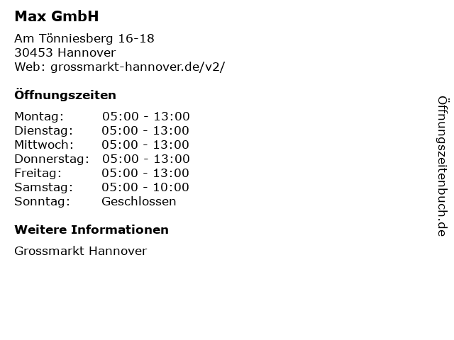| Öffnungszeiten Max GmbH in Hannover anzeigen | |