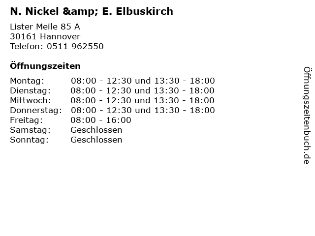 | Öffnungszeiten N. Nickel & E. Elbuskirch in Hannover anzeigen | |