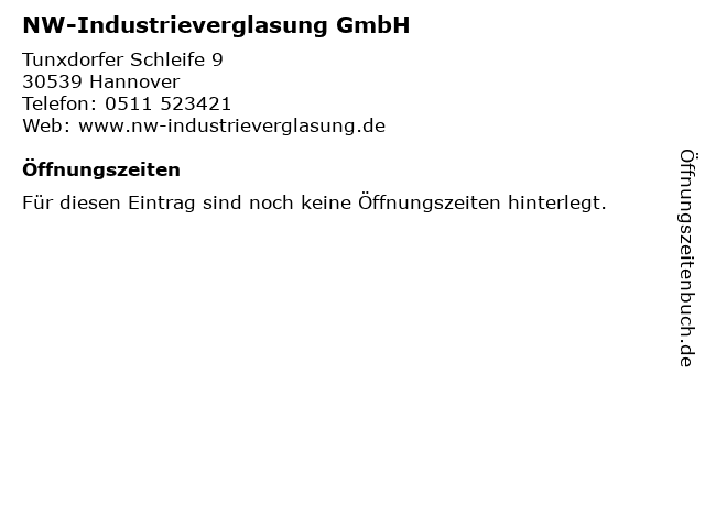 | Öffnungszeiten NW-Industrieverglasung GmbH in Hannover anzeigen | |