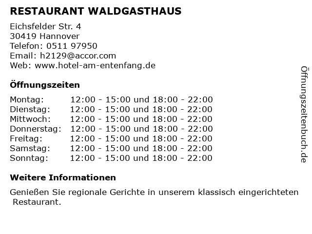 | Öffnungszeiten RESTAURANT WALDGASTHAUS in Hannover anzeigen | |