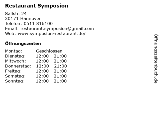 | Öffnungszeiten Restaurant Symposion in Hannover anzeigen | |