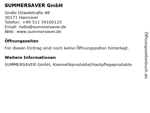 | Öffnungszeiten SUMMERSAVER GmbH in Hannover anzeigen | |