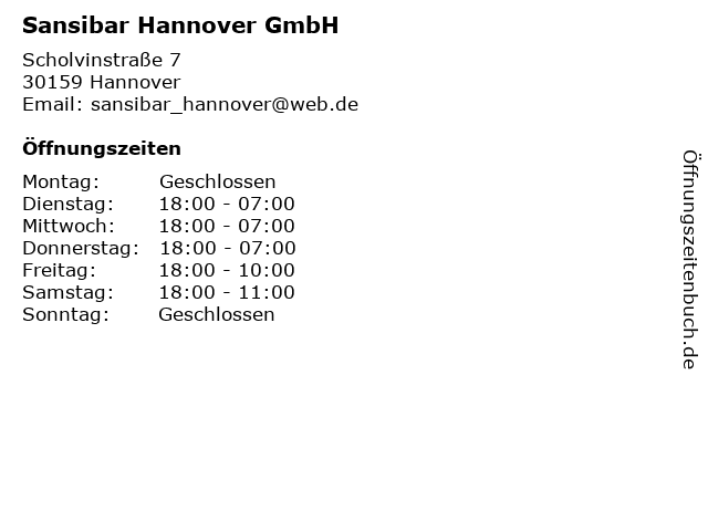 | Öffnungszeiten Sansibar Hannover GmbH in Hannover anzeigen | |