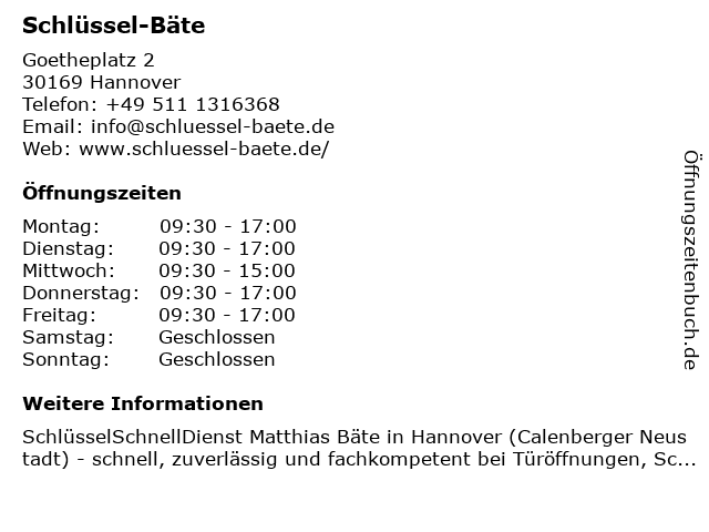 | Öffnungszeiten Schlüssel-Bäte in Hannover anzeigen | |