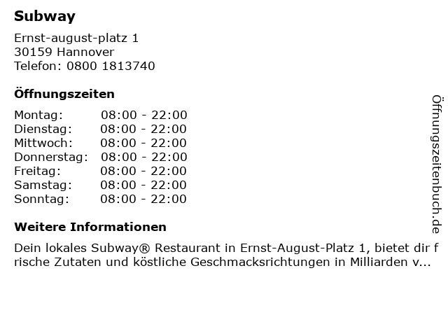 | Öffnungszeiten Subway in Hannover anzeigen | |