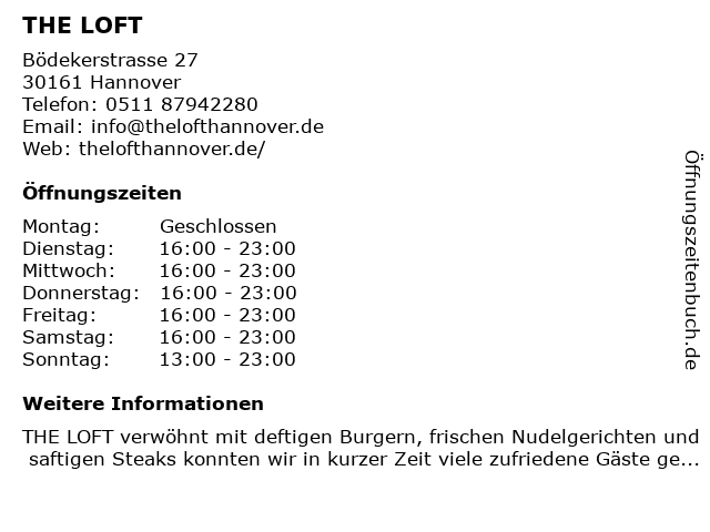| Öffnungszeiten THE LOFT in Hannover anzeigen | |