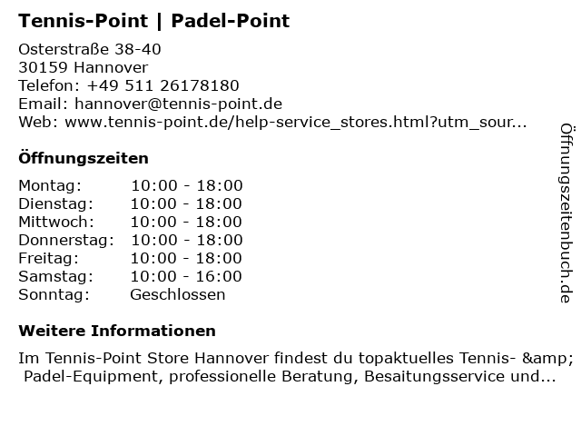 | Öffnungszeiten Tennis-Point | Padel-Point in Hannover anzeigen | |