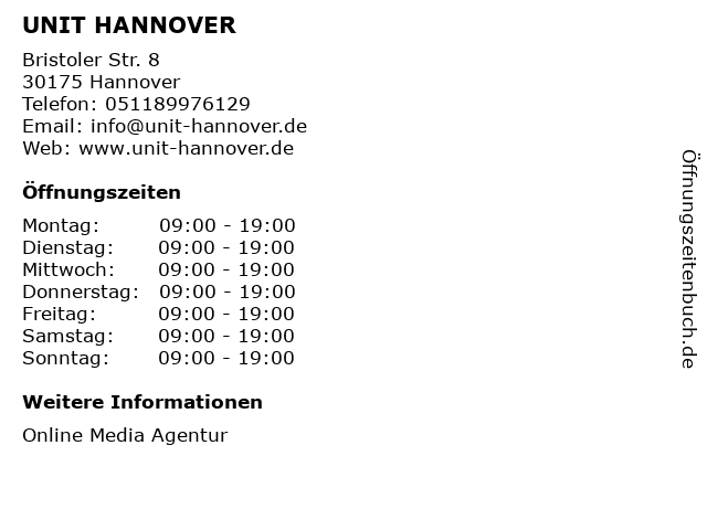 | Öffnungszeiten UNIT HANNOVER in Hannover anzeigen | |