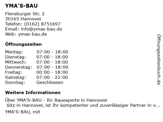 | Öffnungszeiten YMA'S-BAU in Hannover anzeigen | |