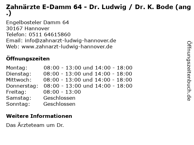 Branchen & Suchbegriffe zu Zahnärzte E-Damm 64 - Dr. Ludwig / Dr. K. Bode (ang.):64, ang., bode, damm, dr., k., ludwig, zahnärzte |