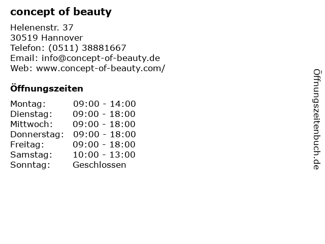 | Öffnungszeiten concept of beauty in Hannover anzeigen | |
