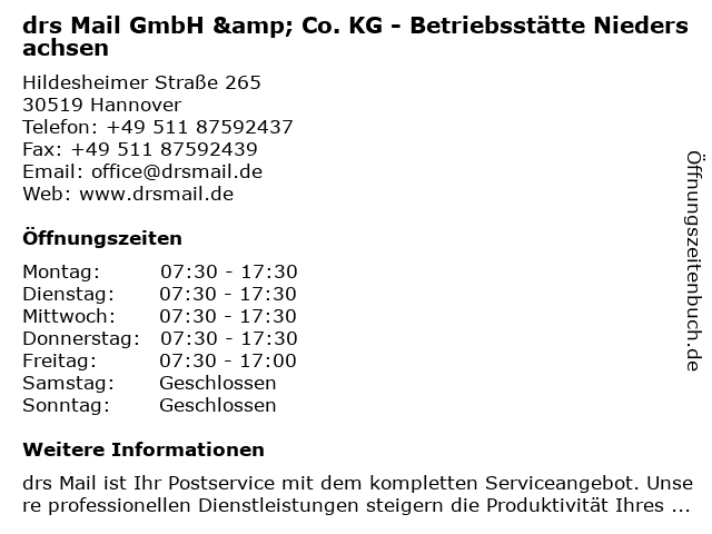 Branchen & Suchbegriffe zu drs Mail GmbH & Co. KG - Betriebsstätte Niedersachsen:bankfahrten, briefversand_digital, filialfahrten, förmliche_zustellung, kurierfahrten, lettershop, postabholung, postfachservice, postservice, poststellenservice |