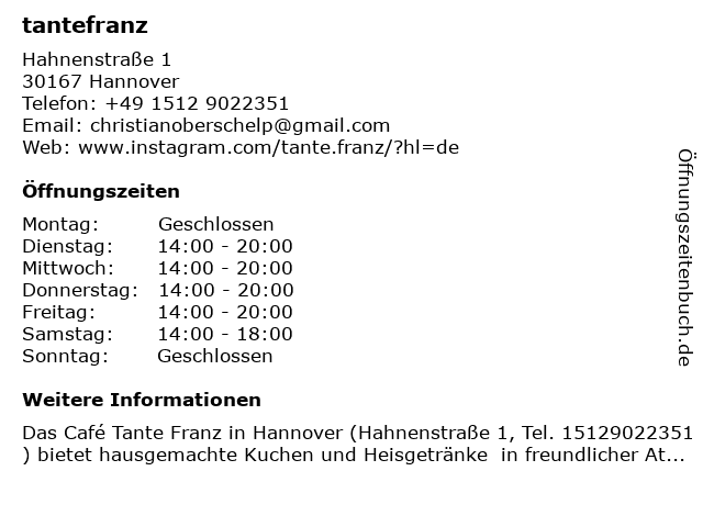 | Öffnungszeiten tantefranz in Hannover anzeigen | |