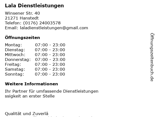 | Öffnungszeiten Lala Dienstleistungen in Hanstedt anzeigen | |
