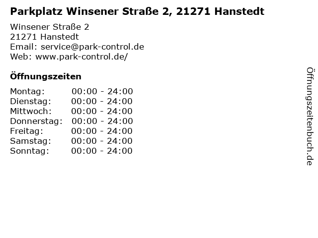 | Öffnungszeiten Parkplatz Winsener Straße 2, 21271 Hanstedt in Hanstedt anzeigen | |