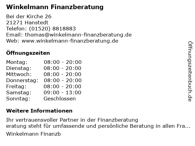 | Öffnungszeiten Winkelmann Finanzberatung in Hanstedt anzeigen | |