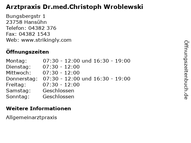 Branchen & Suchbegriffe zu Arztpraxis Dr.med.Christoph Wroblewski:allgemeinarzt, allgemeinmedizin, allgemeinmediziner, arzt, arztpraxis, benecke, dr., dr.med.christoph, hansühn, med, med., praktischer, praxis, sprechzeiten, wilhelm, wroblewski, öffnungszeiten |