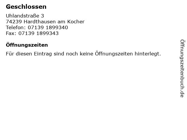 | Öffnungszeiten Geschlossen in Hardthausen am Kocher anzeigen | |