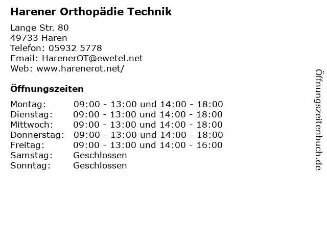 | Öffnungszeiten Harener Orthopädie Technik in Haren anzeigen | |