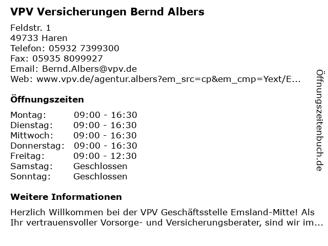 Branchen & Suchbegriffe zu VPV Versicherungen Bernd Albers:albers, altersvorsorge, bernd, berufsunfähigkeitsversicherung, finanzberatung, gebäude- und hausratsversicherung, lebensversicherung, mietrechtsschutzversicherung, pflegeversicherung, versicherungen, vpv |