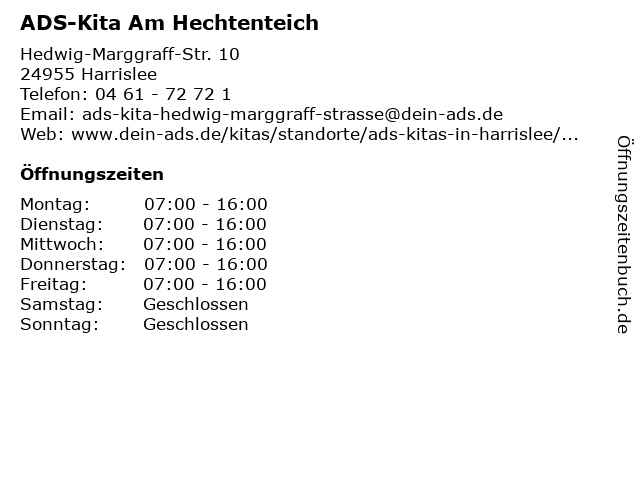 | Öffnungszeiten ADS-Kita Am Hechtenteich in Harrislee anzeigen | |