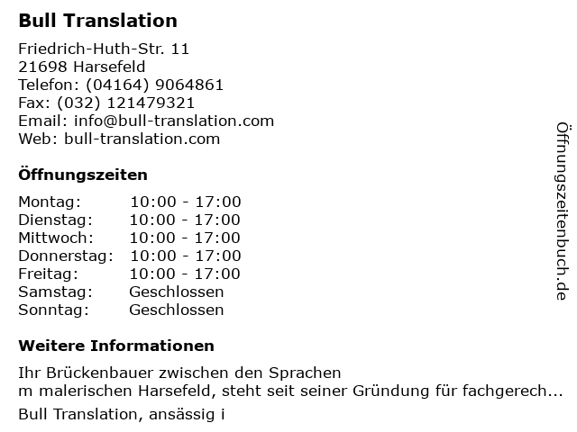 | Öffnungszeiten Bull Translation in Harsefeld anzeigen | |