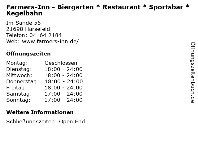 Branchen & Suchbegriffe zu Farmers-Inn - Biergarten * Restaurant * Sportsbar * Kegelbahn:biergarten, farmers, farmers inn, inn, kegelbahn, restaurant, sportsbar |
