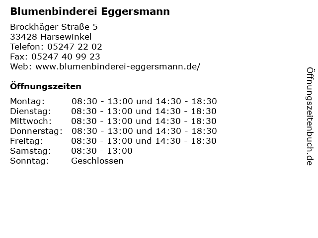 | Öffnungszeiten Blumenbinderei Eggersmann in Harsewinkel anzeigen | |