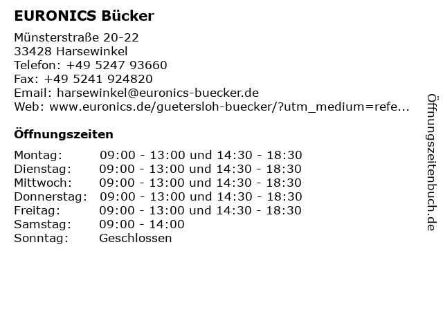 | Öffnungszeiten EURONICS Bücker in Harsewinkel anzeigen | |